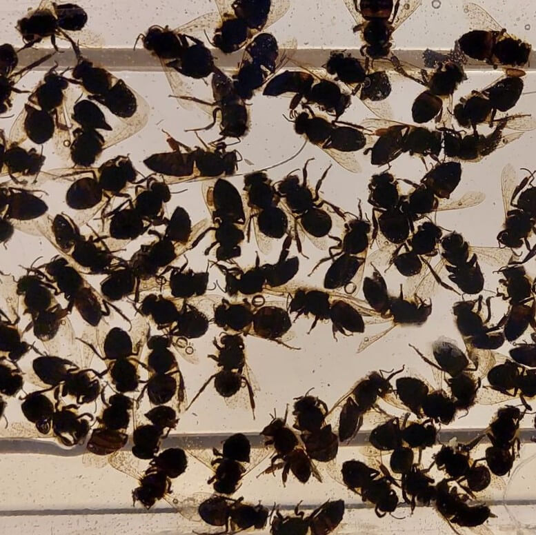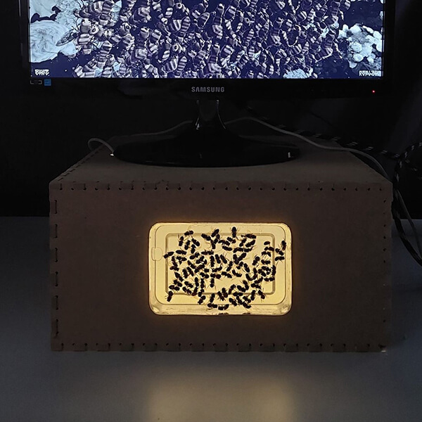 Le mot "Passif" m’a donné l’envie de créer une œ uvre contemplative. j’ai donc créé un environnement que l’on puisse découvrir sans avoir le contrôle de ses déplacements. Quant aux mots contain et habitat, ça m’a inspiré les ruches dans lesquelles nous pouvons contempler le mode de vie des abeilles. J’ai donc créé un virus, ayant les mêmes symptômes que ceux des ordinateurs transformés en botnets et contaminant des abeilles jusqu'à toutes les éliminer. A travers ce projet, je voulais aussi parler de la disparition des abeilles et matérialiser cela par la présence de vraies abeilles mortes de faim et emprisonnées dans de la résine époxy. Le cube de résine s'illuminant à la fin de l’expérience.